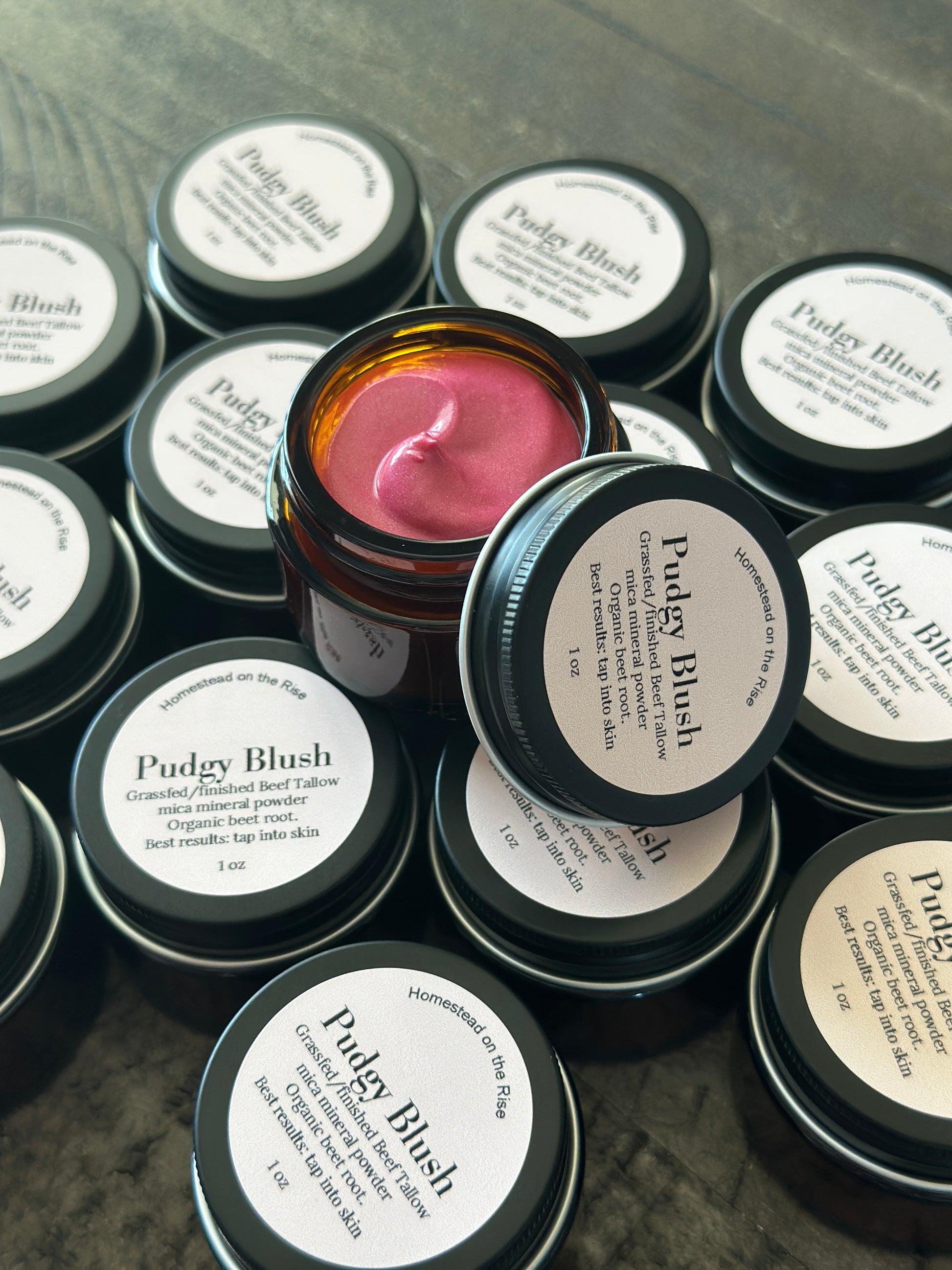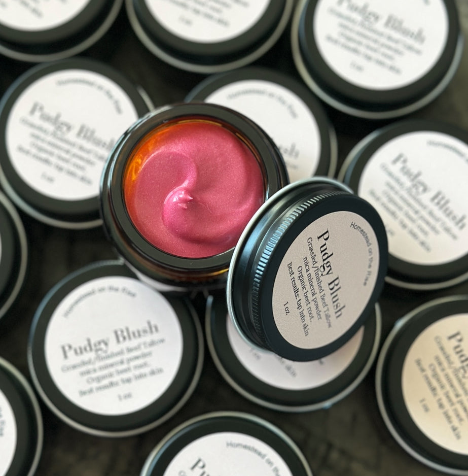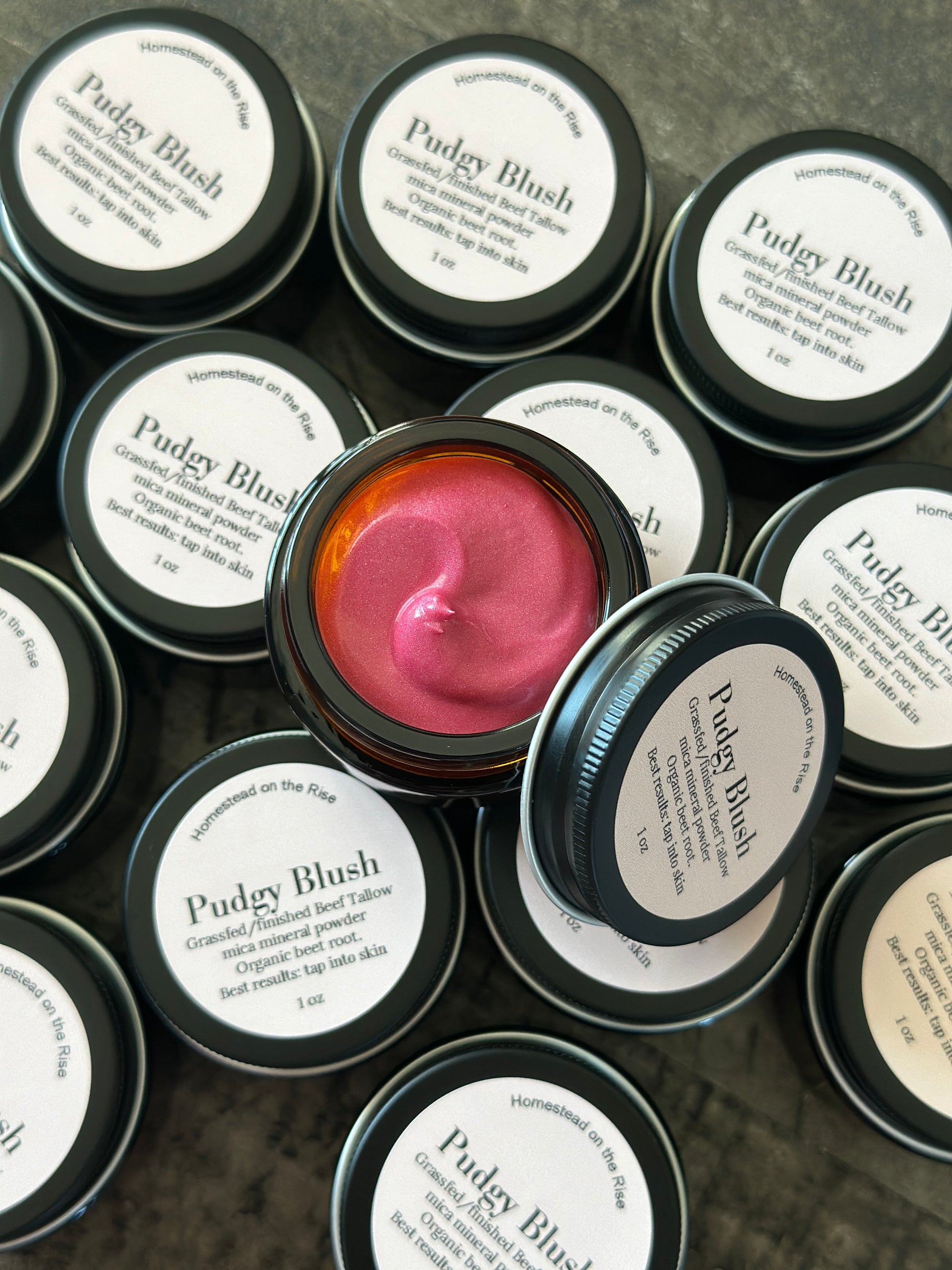Give your cheeks, nose, lips and chest a magical dewy glow with our one of a kind all natural tinted pudgy blush. Made with grass-fed, grass-finished beef tallow and organic beet root powder, your face will be sure to thank you!