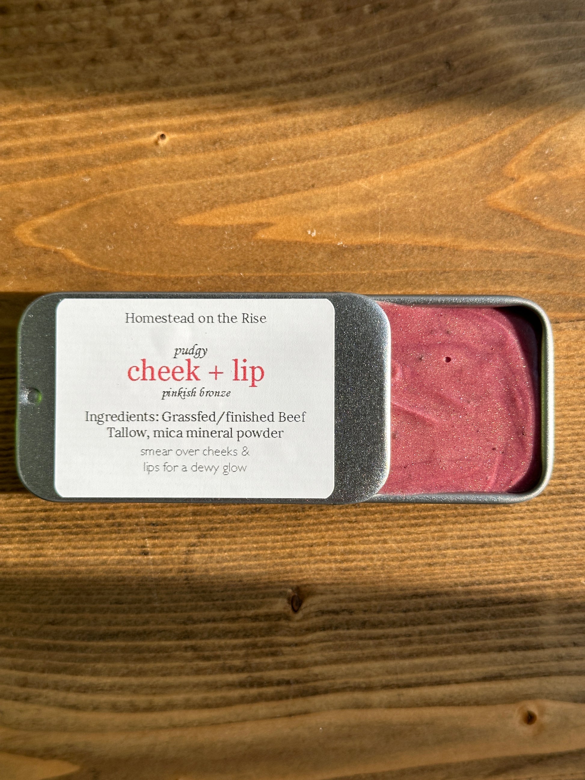 •pink bronze lip + cheek: Grassfed/finished tallow, organic beet root powder, mineral mica powder.